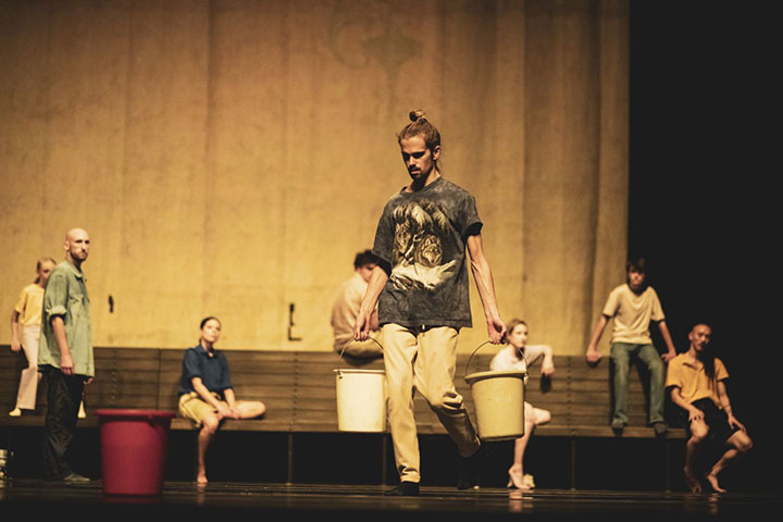 Bis einer mit einem Eimer hereinspaziert. Und die Leinwand fällt. Sie füllen gemeinsam, auch eine Eimerkette wird gebildet, einen riesigen Bottich mit Wasser. Apokalyptische Musik dazu. Sie trennen die lange Bank auf. Ein Segment liegt umgestürzt. Chaos auf der Bühne. Die Welt eine Ruine. Die PerformerInnen nur noch in hautfarbener Unterwäsche. Stille. Sie steigen in Vierergruppen in das Bad, helfen erst, synchronisiert in immer gleicher Choreografie, einem Nachbarn seinen Rücken zu nässen und tauchen schließlich gänzlich ein. Ressourcen schonende rituelle (Rein-) Waschung. Die letzten Wasser des Ganges im Zuber. Einer aber bleibt übrig.