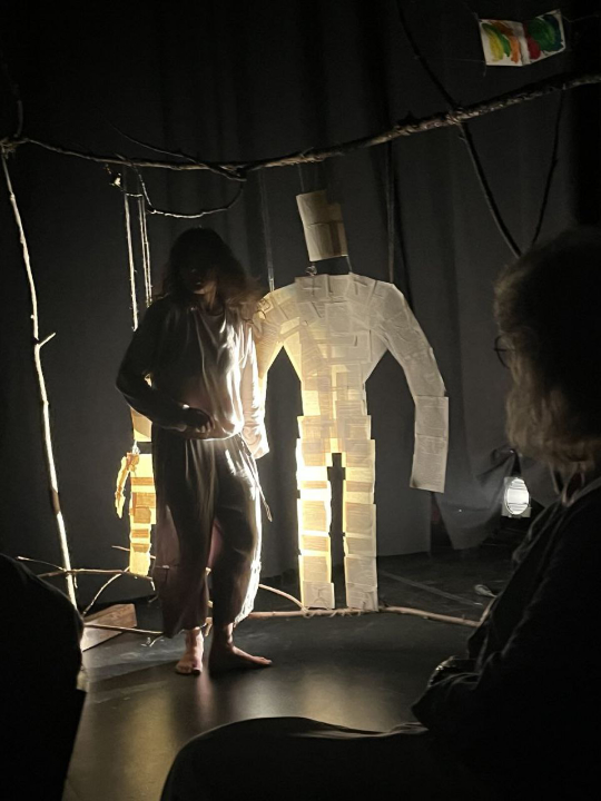 Die Perspektivenvielfalt der kreativen Stationen ist gleichermaßen faszinierend wie die nach der Pause im offenen Theaterraum. Immer mehr an Aktion, an er-forschender Bewegung, an Zwiespalt zwischen Angst, Hoffnung, Erfüllung, Enttäuschung und beglückender, ja tänzerischer wie akrobatischer Leichtigkeit ist zu erkennen, wird erfahrbar. Die Künstlerin lässt mit Bühnenpräsenz, sensibler Ausdrucksstärke und einem hoch individuellen, gekonntem Bewegungs-Repertoire eine breite, selten zu erfahrende Emotionspallette zwischen ihren Fantasiegebilden nachhaltig aufflackern, entdecken. Um, konsequenterweise, schlussendlich sich explosionsartig von allem bisherigen – einem „Kleid‘ aus Buchseiten – zu befreien, um als neuer Mensch einen hochnotwendigen, einen neuen Anfang zu wagen. Außergewöhnlich.