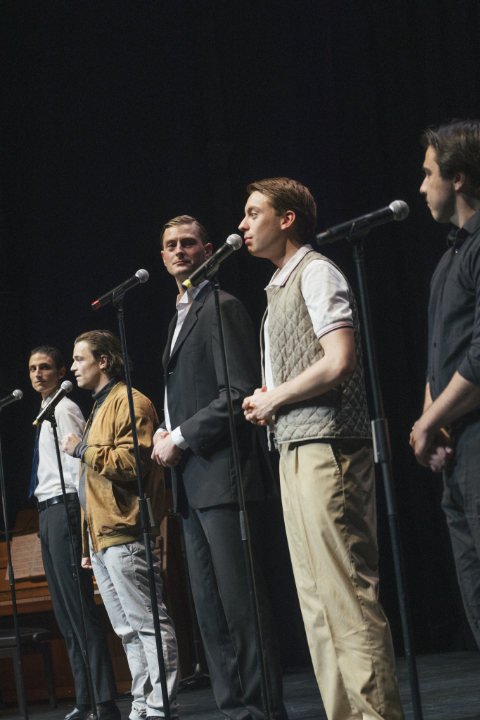 Mit ganz offenen Karten spielen hingegen die Kuratoren Michiel Vandevelde, Pankaj Tiwari und Eneas Prawdzic – sie haben sich längere Zeit in den einschlägigen Kreisen umgeschaut - in „Violenza 2025“: Wenn sie fünf junge Männer aus dem rechten Lager auf der Bühne das Wort erheben lassen: authentisch! Einschmeichelnd vorweg, immer lauter und radikaler, in widersprüchliche, in populistisch vereinfachende Wortkaskasden verstrickt alsbald. Es ist eine politische Lehrstunde der brutalen Art. „Jede Veränderung beginnt mit einem Tabubruch“ verlautet einer der Jünglinge. Er weist damit recht naiv hin auf die bekannten und dankenswerterweise auch auf nicht oder noch nicht bekannten Gefahren in tabubrechenden, einseitigen Parolen wie in diesen Brandreden. Die posierende Schar halbnackter, muskelspielender Männer, drapiert zwischen „griechischen“ Säulen, lässt das erschreckend assoziativgetränkte Phrasenfass zum Überlaufen bringen: Beim Publikum zu sehr zögerlichem Applaus und zur Frage, ob ein derartiges, auch dem noch so Blinden endlich die Augen öffnendes ‚Performen‘ nicht eigentlich stärkeren, ‚dankbaren‘ Applaus verdient – bei aller weitgehend fehlender Bühnen-Kunst und Kultur.