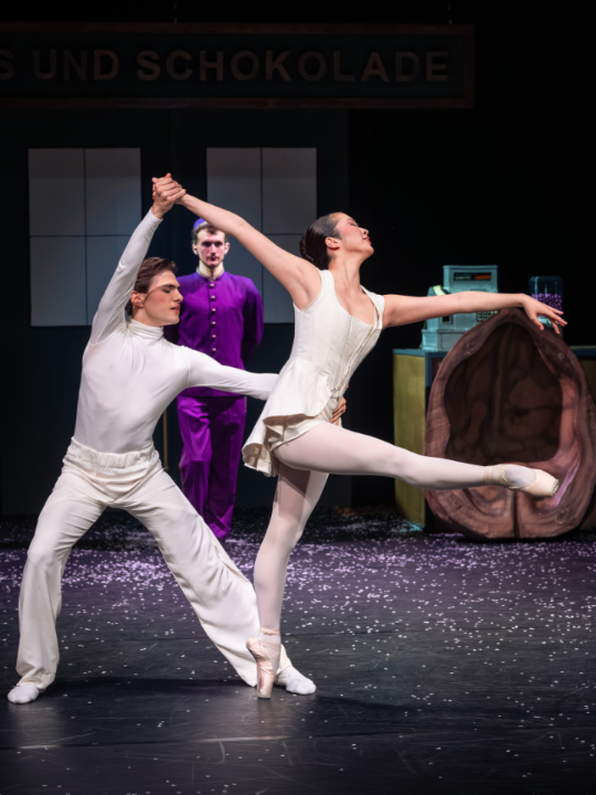 Peci Nussknacker4Natürlich fehlen weder der Schneeflockenwalzer noch der Grand pas de deux, das virtuose Finale des Balletts, bei dem üblicherweise Ersten Solist*innen glänzen können. Auch hier hat sich Eno Peci für die jungen Tänzer*innen eine geschickte Variante einfallen lassen: Statt sie mit technischer Perfektion zu überfordern, lässt er sie als zu Eiskonfekt geformte Puppen auftreten, die wiederholt erstarren. In diesen Rollen bestachen Nanoka Shimada und Charlie Keffert mit technischer Sicherheit.Peci Nussknacker